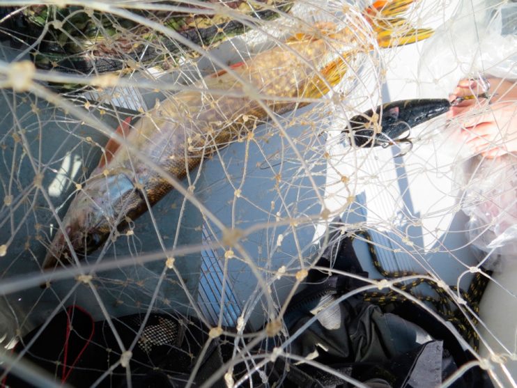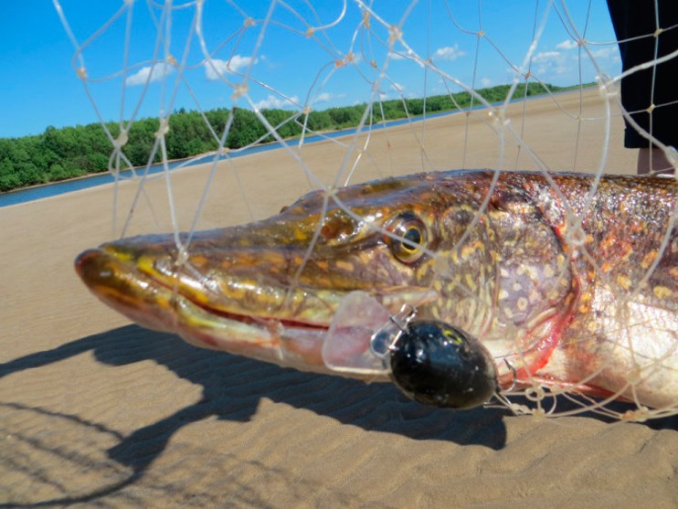 Выбрали глубинку с метра четыре и пошли вдоль свала, выискивая по эхолоту. Километр тишина, два тишина. Уж, подумали, и чего мы с Лаи уехали. Надо было там походить, побродить чуток. Вдруг у меня мощный зацеп, стоп машина! Да какой там зацеп, он вдруг взял и попер в сторону, крепко нажимая на кончик моего нового тролля. Фрикцион загудел, аж задымился. Притянул тормозок малось, стал подматывать неизвестный объект ближе к берегу. Подводная лодка же норовит лодку стороной миновать, поворачивает нас, как поплавок легкий. Пришлось совершить ошибку, развернуть уду в другую сторону. Понимаю, что резкий поворот в движении рыбы, может вырвать крюк из зацепа. Да уверен в тройнике. Потому и повернул рыбку в другую сторону. Теперь лодка стала тормозить и избавилась от кругового вращения. Миша уж подсак в воду отпустил поглубже. Подтаскиваю к лодке. Рыбка не поднимается. Делаю усилие, при этом нельзя медлить, иначе может под лодку уйти, да за мотор крутануть нитку, тогда пиши, пропало. Появляется здоровенная тень. Михаил подхватывает её снизу. И о, блин, мы молчим и смотрим, округлив глаза. Ограменная щучина висит на половину головой в подсаке, наполовину, хвостом свесившись на другую сторону. Доли мгновений кажутся часом. Напарник делает еле уловимое движение подсачника от себя, как бы подсекает рыбку снизу, и щучина грузно переваливается в подсак. Подсак поворачивает под 90 градусов, кошель замкнулся и тащит на себя, не вынимая из воды. Через борт. И, о! Радость, щучина в лодке. Михаил удерживает её руками, чтоб не вырвалась. Я ж завожу мотор, и летим к берегу!
