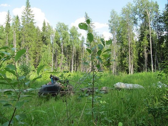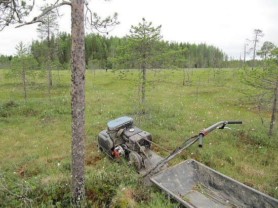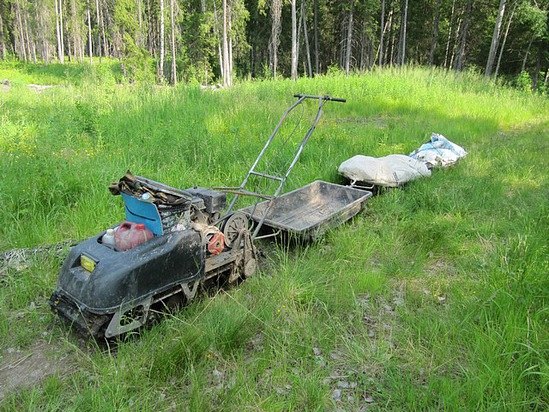 Прошлый прорыв на Ижмозеро можно, по правде сказать, был революционным в области использование мотобуксировщиков для перевозки таежников и грузов летом по бескрайним северным походам. Одно дело двигаться по зимникам и направлениям рядом с основными дорогами, другое дело оторваться от техподдержки и устремиться в тайгу. Четыре километра зимника и четыре болотами разной категории сложности с различным растительным покрытием от моха до кочек, от трясины до сосновой или березовой поросли. В прошлый раз был просто поражен представившимися возможностями.
