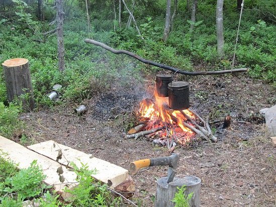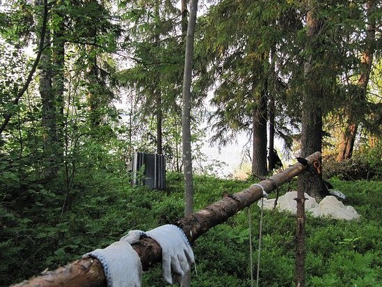 Тропки почти не видно. Выходим на заброшенный бивак. Костерок зарос мхом. Пару полуистлевших удилищ. Рядом гнилая жердь в берег воткнута. Жерлицу ставили. Поймали ли первооткрыватели чего на озере и почему больше здесь не бывают.