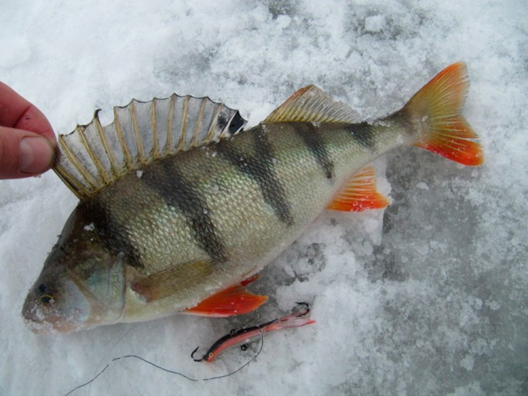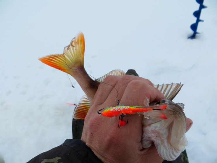 Сверлил долго. Почти под ручку. Ледище, даж не верится, кой-как спортивного бура хватило. Подо льдом нужный метр. Лов начинаю с самого верха, почти по льду подстукиваю. Шум создаю, и потихоньку опускаю. Подброшу замру , до десяти посчитаю. Вновь подкину и уже остановлю сантиметров десяток пониже. Вновь считаю. Минуты за две опустился ко дну. Повыделывал кивком и хлыстиком различные «па». Жаль, окушок не оценил мои таланты. Всё, сматываюсь, бегу к палатке. Задубел полностью, да и сам, як сугроб. Её, милую, снегом присыпать начало