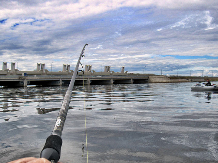 Прибыв на точку, мы обнаружили, что направление течения не совсем обычное - струя направляется в сторону города, а не наоборот, что бывает намного чаще. Впрочем, течение было несильным. После недолгих переборов «чебурашек» я остановился на весе 24 грамма. Тихая погода дала возможность наблюдать, как отыгрывает кончик спиннинга в момент касания приманкой дна. Это было видно превосходно.