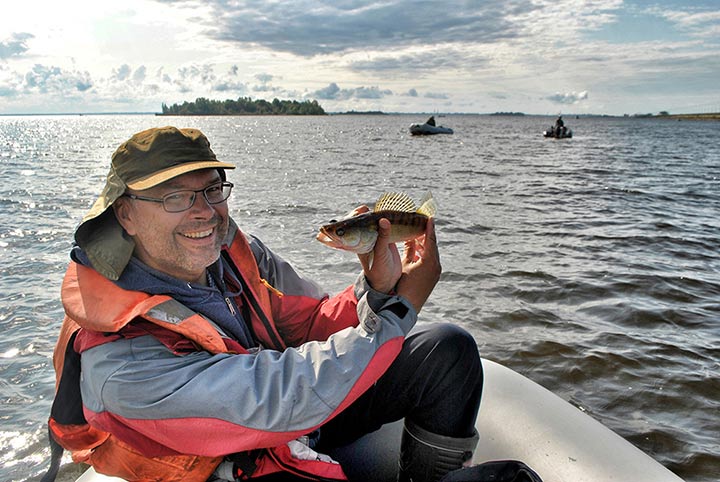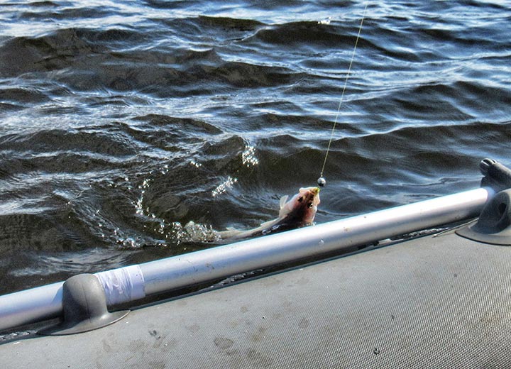 На одной проводке могло случиться по несколько поклевок. Сходы были постоянно, но какая-то часть рыбы все же попадала в лодку и после фотосессии отправлялась в родную стихию. Иногда судак багрился. |