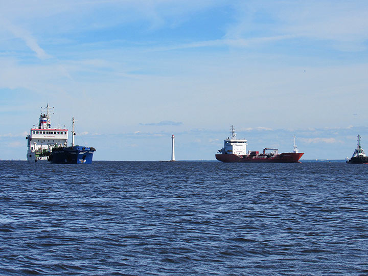 Более глубокий и широкий южный фарватер проходит между Кронштадтом и началом южной ветки дамбы. |