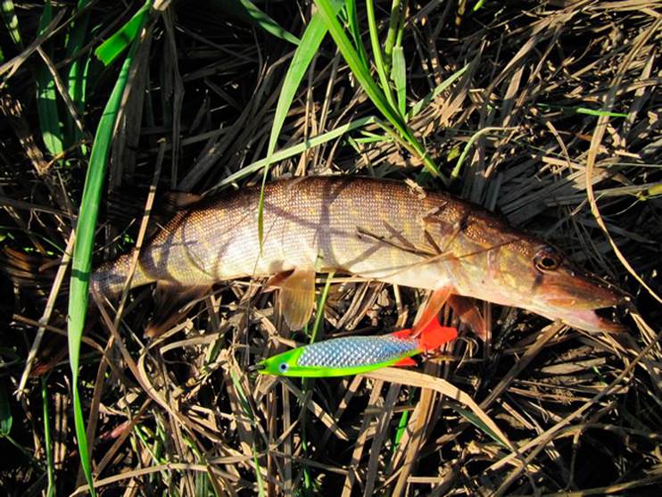 Фото. Щука поймана на блесну-колебалку AQUA Тобик