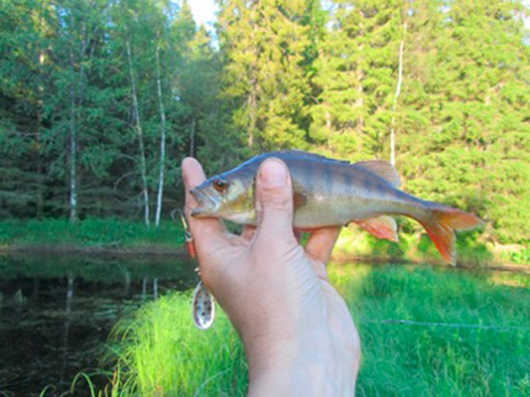 Берег до того кочкарный, что на десять метров тратишь минут пять. Ногу думаешь куда поставить, пробуешь, удержит ли кочка, есть ли дальше опора иль обратно возвращаться, меж кочек топь, да еще ивняк путается. Блин, местечко рыбка выбирает, и правда, непролазное. Про колебалку лучше не упоминать, так надеялся, что глубинки хватит! Ставлю вертушечку. Проводочка по поверхности. Тащу кучу водорослей. От же засада. Второй заброс, скоростная проводка. Водорослей нет, и поклевок нет. Третий заброс, контролирую блесну зрительно, благо чистота воды позволяет. Заглубляя до четверти, не более. С боку расходятся усы волн, к блесенке устремляется рыбинка. Мимо. Вновь заброс метра три дальше места атаки, проводка, рыбка активно бросается на блесну. Подсечка, и первый окунишка, трепыхаясь, летит по поверхности, через траву ко мне. Несколько забросов, справа в заливчике пусто, закидываю в левую лагунку. Тычок сразу. Окунек стандартный.